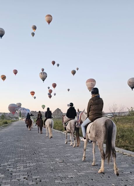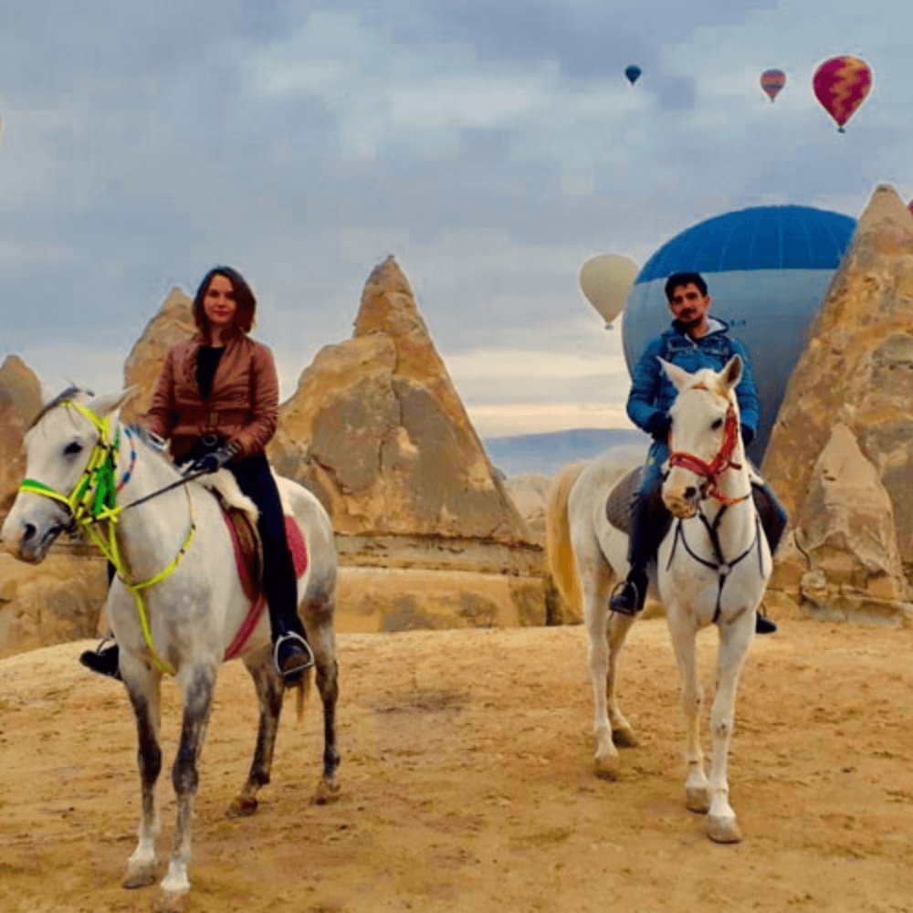 As the sun begins its ascent over the mesmerizing landscapes of Cappadocia, you embark on an exhilarating horse ride in golden light of the early morning with hundreds of balloons flying above you.